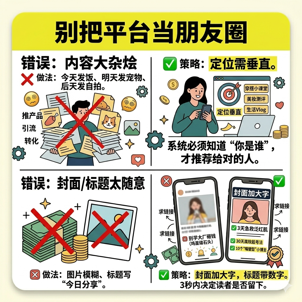 封面糊糊的、字都看不清;标题写“今日分享”“随便记录一下”…用户刷到一秒划走。