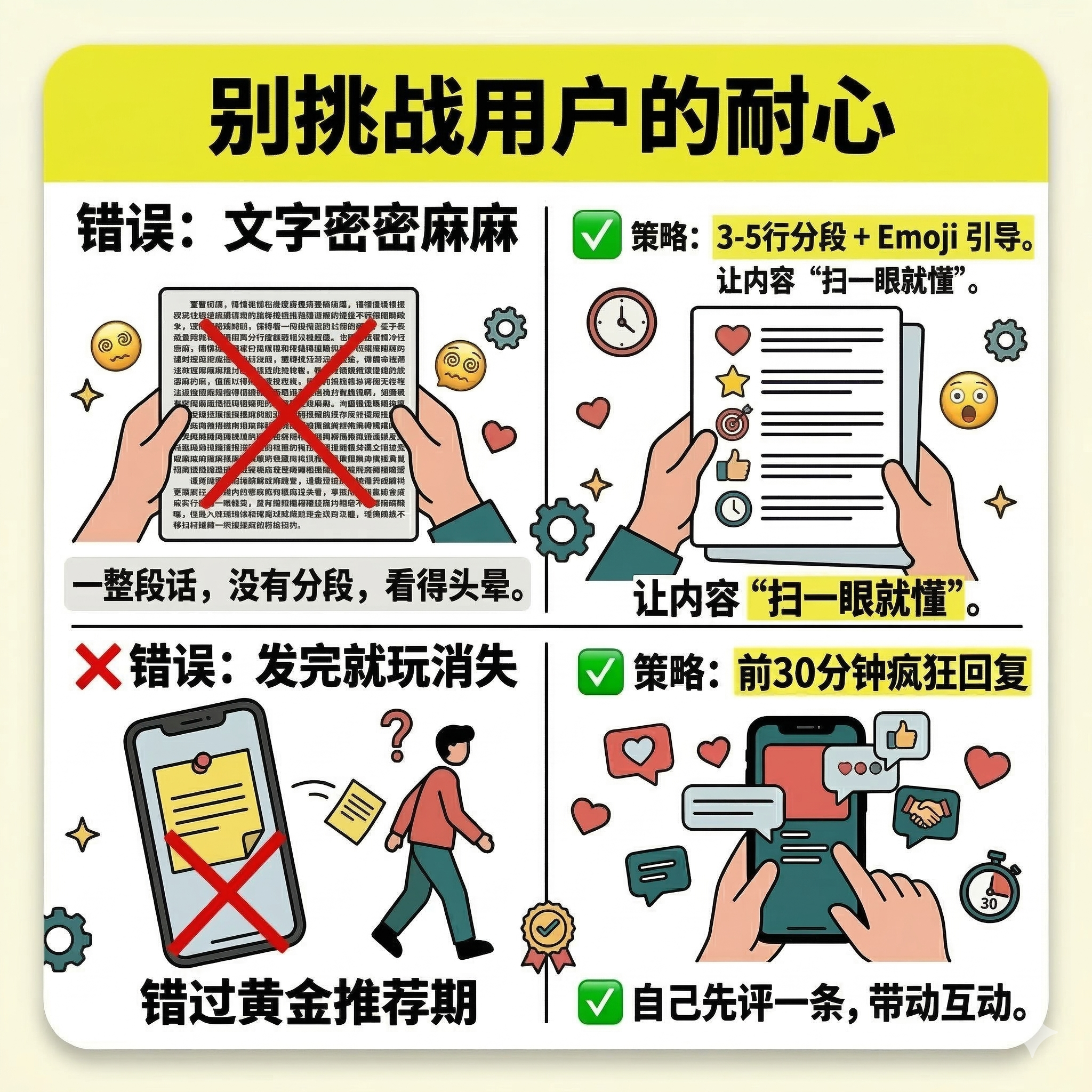 发完自己先评一条(比如“清单在这儿自取”),有人评论立刻回。前30分钟互动越好,系统推得越多。